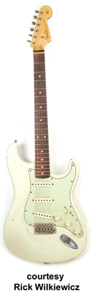 FENDER | Stratocaster: Custom Shop Time Machine/Relic Series | In 1994, Fender Custom Shop manager John Page, Fender Custom Shop Master Builder Jay Black, and Black's friend Vince Cunetto developed the first Fender Relic prototype guitars. Cunetto had established himself in building Telecaster replica bodies and Page and Black from the Custom Shop took note of his abilities. At the 1995 Winter NAMM show, Fender displayed two new Relic prototype guitars that were built by Black and Cunetto. Response from dealers was strong and Fender decided to add these guitars to their catalog; however, they decided that the Fender Custom Shop was not properly equipped to produce these guitars, so they hired Cunetto as an independent contractor to "Relic" the guitars. The first Relic guitars were introduced in 1996 with a '50s model and a '60s model and Cunetto continued to age and relic these guitars through 1998. It should be noted that Cunetto and his crew did not build, cut, or assemble any of these guitars - they simply did prep work, finishing, and distressing/aging of the guitars. In 1999, Fender reorganized their effort and moved all production into their Custom Shop. They also introduced two new finishes/wears along with Relic: NOS and Closet Classic. Built to exacting specifications of their respective vintages, body contours and radii, neck shape, fingerboard radius, pickups, electronics and hardware. Original materials, tooling and production techniques are employed whenever possible, available in three distinct finish packages: NOS (New-Old Stock), as if the guitar was bought new in its respective year and brought forward to the present day; Closet Classic, as if guitar was bought new in its respective year, played perhaps a dozen times a year and then put carefully away (has a few slight dings, lightly checked finish, oxidized hardware and aged plastic parts) Relic, shows natural wear and tear of years of heavy use - nicks, scratches, worn finish, rusty hardware and aged plastic parts. Instruments are stamped on the headstock and into the body under the pickguard to avoid market confusion with actual vintage guitars. In 2009, Fender discontinued the Closet Classic finish leaving only the NOS and Relic models. Fender also introduced the Classic HBS-1 Stratocaster that combines elements from both vintage and modern designs. The body, neck, and overall design are styled after a 1950s Stratocaster, but the pickups, electronics, and bridge are from modern designs. | '50S RELIC STRATOCASTER (U.S. MFG. NO. 010-5802/5812) | - offset double cutaway light ash body, bolt-on maple neck, 21-fret maple fingerboard with black dot inlay, six-on-one-side tuners, vintage-style tremolo, aged white pickguard, three Custom '54 single coil pickups with aged covers, three aged knobs (v, two tone) aged nickel hardware, available in 2-Color Sunburst or Vintage Blonde finish, mfg. 1996-98. |