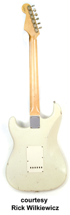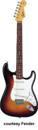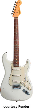 '60S RELIC STRATOCASTER (U.S. MFG. NO. 010-6400/6410) | - offset double cutaway alder body, bolt-on maple neck, 21-fret rosewood fingerboard with pearl dot inlays, six-on-one-side tuners, vintage-style tremolo, aged white pickguard, three Custom '60s single coil pickups with aged covers, three aged knobs (v, two tone) aged nickel (6400) or gold (6410) hardware, available in 3-Color Sunburst or Olympic White finish, mfg. 1996-98. |