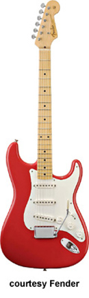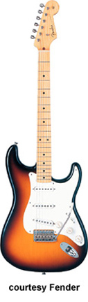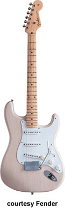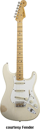 '56 STRATOCASTER NOS (NO. 015-0402/0412) | - double cutaway alder or ash body, bolt-on 10/56 shaped maple neck, 21-fret maple fingerboard with black dot inlays, six-on-one-side tuners, vibrato bridge, single-ply white pickguard, three Custom '50s single coil pickups, three knobs (v, two tone), three-way switch, available in 2-Color Sunburst, Black, Desert Sand (new 2009), Fiesta Red (1999-2008), or White Blonde (1999-2008) finish, mfg. 1999-present. |