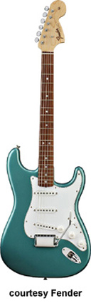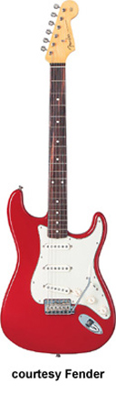 '66 STRATOCASTER NOS (NO. 150-6600/6602) | - double cutaway alder body, bolt-on C-shaped maple neck, 21-fret maple (6602) or rosewood (6600) fingerboard with dot inlays, large late 1960s-style headstock with six-on-one-side F-key tuners, vibrato bridge, three-ply white/black/white pickguard, three Custom '65 single coil pickups, three knobs (v, two tone), three-way switch, chrome hardware, available in Candy Apple Red, Firemist Gold Metallic, or Teal Green Metallic finish, mfg. summer 2004-08. |