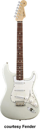 '65 STRATOCASTER NOS (NO. 015-2700) | - double cutaway alder body, bolt-on C-shaped maple neck, 21-fret rosewood fingerboard with pearl dot inlays, six-on-one-side tuners, vibrato bridge, white pickguard, three Custom '65 single coil pickups, three knobs (v, two tone), three-way switch, chrome hardware, available in 3-Color Sunburst, Charcoal Forst Metallic, Lake Placid Blue, or Olympic White finish, mfg. 2003-06. |