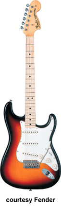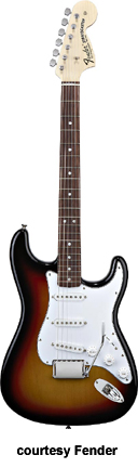 '69 STRATOCASTER NOS (NO. 015-1700/1702) | - double cutaway alder body, bolt-on U-shaped maple neck, 21-fret maple (1702) or rosewood (1700) fingerboard with dot inlays, large late 1960s-style headstock with six-on-one-side tuners, vibrato bridge, three-ply white/black/white pickguard, three Custom '60s single coil pickups, three knobs (v, two tone), three-way switch, chrome hardware, available in 3-Color Sunburst, Black, Olympic White (1999-2008), or Vintage White (new 2009) finish, mfg. 1999-present. |