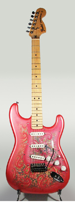 FENDER | Stratocaster: Fender Japan Limited Edition Series | The following models were limited edition instruments produced by Fender Japan, and available through custom order. | PAISLEY STRAT (JAPAN MFG.) | - offset double cutaway ash body, bolt-on maple neck, 21-fret maple fingerboard with black dot inlay, six-on-one-side tuners, standard vibrato, Paisley pickguard, chrome hardware, three single coil pickups, three knobs (v, two tone), five-position switch, available in a Pink Paisley finish, mfg. 1988-1994. |