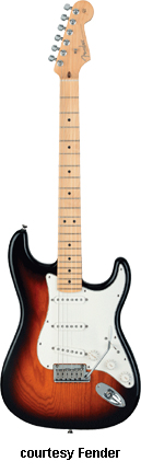 '58 STRATOCASTER (U.S. MFG. NO. 010-0802/0812) | - offset double cutaway ash body, bolt-on maple neck, 21-fret maple fingerboard with black dot inlay, six-on-one-side tuners, vintage-style vibrato bridge, white agedpickguard, three Fat '50s single coil pickups, three aged knobs (v, two tone), three-way switch, chrome (0802) or gold (0812) hardware, available in 2-Color Sunburst, 3-Color Sunburst, Black, or Blonde finish, mfg. 1996-98. |