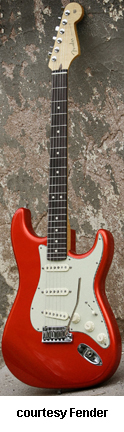 1960 STRATOCASTER (U.S. MFG. NO. 010-6000/6010) | - offset double cutaway alder body, bolt-on lightly figured maple neck, 21-fret rosewood fingerboard with pearl dot inlay, six-on-one-side tuners, vintage-style vibrato bridge, white aged pickguard, three Texas Special single coil pickups, three aged knobs (v, two tone), three-way switch, available in 3-Tone Sunburst, Black, Olympic White, or Custom Color finishes, mfg. 1992-98. |