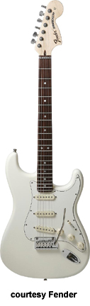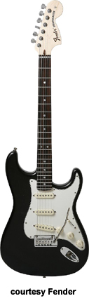 '69 STRATOCASTER (U.S. MFG. NO. 010-6900/6902) | - offset double cutaway alder body, bolt-on maple neck, 21-fret maple (6902) or rosewood (6900) fingerboard with pearl dot inlay, oversized late 1960s style headstock with six-on-one-side tuners, vintage-style vibrato bridge, white pickguard, three Custom '69 single coil pickups, three knobs (v, two tone), three-way switch, chrome hardware, available in 3-Tone Sunburst, Black, or Olympic White finish, mfg. 1997-98. |