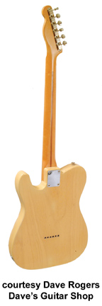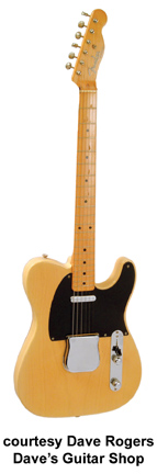 TELECASTER (FENDER MFG. 1951-1964) | - single cutaway ash body with routing channel between the pickups, bolt-on maple neck, 21-fret maple fingerboard with black dot inlay, "Telecaster" logo on headstock with six-on-one-side tuners, STB anchored bridge with three paired-string adj. saddles, black pickguard, two single coil pickups, two knobs (v, tone) and a three-way switch mounted on a metal plate, chrome hardware, available in Blonde finish, mfg. 1951-1964. |