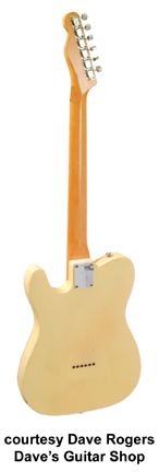 TELECASTER (CBS MFG. 1965-1983) | - single cutaway ash body with routing channel between the pickups, bolt-on maple neck, "F" stamp on neckplate, 21-fret maple fingerboard with black dot inlays (1967-1982) or rosewood fingerboard with pearl dot inlays (1965-69), "Telecaster" logo on headstock with six-on-one-side tuners, STB anchored bridge with three paired-string adj. saddles, white pickguard, two single coil pickups, two knobs (v, tone) and a three-way switch mounted on a metal plate, chrome hardware, available in Blonde finish, mfg. 1965-1982. |