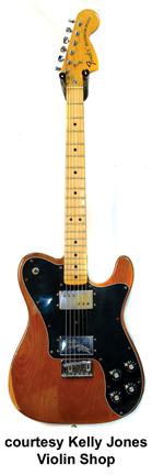 DELUXE TELECASTER (MFG. 1972-1982) | - single cutaway poplar body, contoured back, bolt-on maple neck, 21-fret maple fingerboard with black dot inlays, 1970s Stratocaster-style headstock with six-on-one-side tuners, six saddle bridge, black pickguard, two humbucker pickups, four knobs (two v, two tone), three-way switch, available in Blonde, Sunburst, Olympic White, Black, Walnut, Antigua (1977-79), or Natural finish, mfg. 1972-1982. |