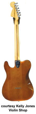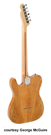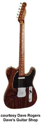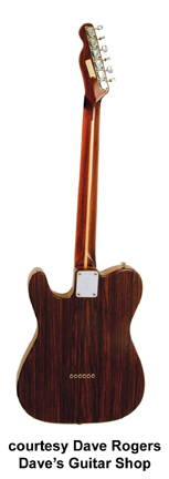 ROSEWOOD TELECASTER (U.S. MFG.) | - single cutaway rosewood body, bolt-on rosewood neck, 21-fret rosewood fingerboard with pearl dot inlays, rosewood headstock with six-on-one-side tuners, strings through bridge with cover, black pickguard, two single coil pickups, two knobs (v, tone) and a three-way switch mounted on a metal plate, chrome hardware, available in Natural finish, mfg. 1969-1972. |