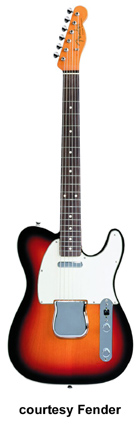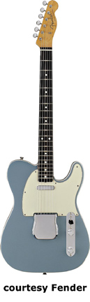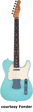 '62 TELECASTER CUSTOM (U.S. MFG. NO. 010-6200) | - single cutaway alder body, bolt-on maple C-shaped neck, bound top and back, 21-fret rosewood fingerboard with pearl dot inlays, six-on-one-side vintage style tuners, vintage Tele bridge, aged three-ply pickguard, two '62 Tele single coil pickups, two knobs (v, tone) and a three-way switch mounted on a metal plate, chrome hardware, available in 3-Color Sunburst, Black, Candy Apple Red (1999-2001), Dakota Red (2001 only), Ice Blue Metallic (2001-06), Inca Silver (2001 only), Ocean Turquoise (2002-06), Surf Green (2002-present) finish, 25.5 in. scale, mfg. 1999-present. |