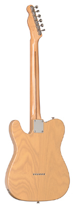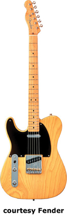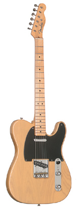 '52 TELECASTER (U.S. MFG. NO. 010-0202/010-1303) | - single cutaway light ash body based on the 1952 Telecaster, bolt-on maple neck, 21-fret maple fingerboard with black dot inlay, vintage-style fixed bridge with cover, black pickguard, two American Vintage single coil pickups, two knobs (v, tone) and a three-way switch mounted on a metal plate, chrome hardware, available in Black (1998-2000), Butterscotch Blonde, or Copper (1998-99) finish, mfg. 1982-present. |