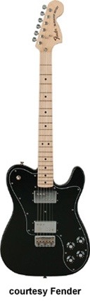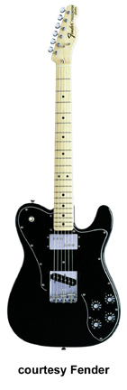 '72 TELECASTER CUSTOM (MEX. MFG. NO. 013-7500/7502) | - single cutaway poplar or alder body, bolt-on maple "U"-shaped neck, Micro-Tilt neck adjustment, Bullet truss rod, 21-fret maple fingerboard with black dot inlays (7502) or rosewood fingerboard with pearl dot inlays (7500), six-on-one-side Fender/Schaller "F" style tuners, vintage style 6-saddle Tele bridge, three-ply pickguard, one Fender "Wide Range" Humbucker pickup and one single coil Tele pickup, four knobs (two v, two tone), three-way switch, available in 3-Color Sunburst or Black finish, 25.5 in.scale, mfg. summer 1999-present. |