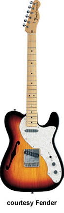 '69 TELECASTER THINLINE (MEX. MFG. NO. 013-6902) | - single cutaway semi-hollow mahogany or ash body, bolt-on one-piece maple neck, 21-fret maple fingerboard with black dot inlays, six-on-one-side Schaller vintage "F" tuners, three-saddle STB bridge, white shell pickguard, two Vintage Tele pickups, two knobs (v, tone), three-way switch, available in 2-Color Sunburst, 3-Color Sunburst, Black, or Natural finish, 25.5 in. scale, mfg. summer 1999-present. |