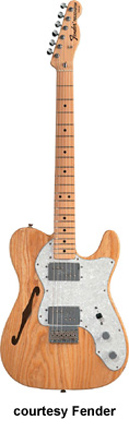 '72 TELECASTER THINLINE (MEX. MFG. NO. 013-7402) | - single cutaway semi-hollow ash body, single f-hole, bolt-on maple neck, 21-fret maple fingerboard with black dot inlays, Bullet truss rod, six-on-one-side Fender/Schaller "F" style tuners, 70s Strat non-tremolo bridge, white Pearloid pickguard, two Fender Reissue Wide Range humbucker pickups, two knobs (v, tone), three-way switch, available in 3-Color Sunburst or Natural finish, 25.5 in. scale, mfg. summer 1999-present. |