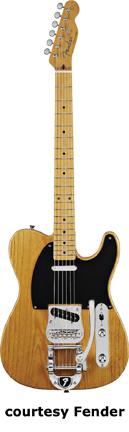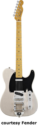 '50S TELECASTER WITH BIGSBY (JAPAN MFG. NO. 025-6702) | - single cutaway ash body, bolt-on maple C-shaped neck, 21-fret maple fingerboard with dot inlay, six-on-one-side tuners, three-ply white pickguard, adjustable bridge with Bigsby vibrato and F tailpiece, two vintage-style Tele single coil pickups, two knobs (v, tone) and a three-way switch mounted on a metal plate, chrome hardware, available inWhite Blondeor Antique Natural finish, mfg. 2005-06. |
