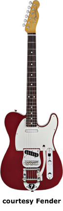 '60S TELECASTER WITH BIGSBY (JAPAN MFG. NO. 025-6800) | - single cutaway alder body, top and back body binding, bolt-on maple neck, 21-fret rosewood fingerboard with dot inlay, six-on-one-side tuners, adj. bridge with Bigsby vibrato and F tailpiece, three-ply white pickguard, two vintage-style Tele single coil pickups, two knobs (v, tone) and a three-way switch mounted on a metal plate, chrome hardware, available in 3-Color Sunburst or Candy Apple Red finish, mfg. 2005-present. |