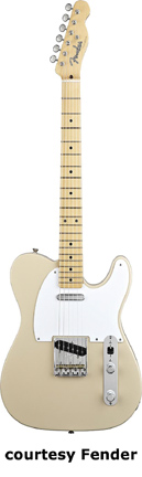 '50s TELECASTER (MEX. MFG. NO. 013-1202) | - single cutaway solid ash body, bolt-on one-piece maple neck, 21-fret maple fingerboard with black dot inlays, six-on-one-side Fender vintage style tuners, three-saddle STB bridge, single-ply white pickguard, two Vintage Tele pickups, two knobs (v, tone) and a three-way switch mounted on a metal plate, chrome hardware, available in 2-Color Sunburst, Black, or White Blonde finish, 25.5 in. scale, mfg. summer 1999-present. |