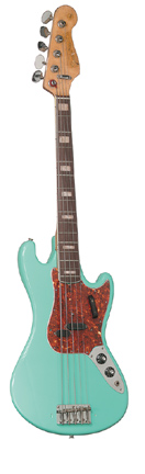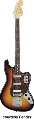 '64 BASS VI REISSUE (CUSTOM SHOP NO. 150-0060) | - offset double cutaway select alder body, bolt-on small C-shaped maple neck, 21-fret rosewood fingerboard with dot inlay, large headstock with six-on-one-side Gotoh tuners, vintage Floating tremolo with lock, four-ply tortoise pickguard, three custom Jaguar single coil pickups, two knobs (v, tone), four slider switches mounted on a metal plate (three on/off, one low cut), chrome hardware, deluxe black hardshell case included, available in 3-Color Sunburst, mfg. 2006-08. |