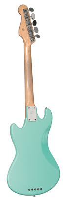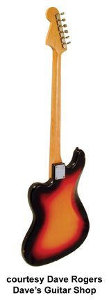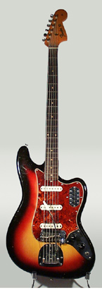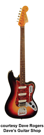 BASS VI (U.S. MFG.) | - offset double cutaway asymmetrical ash body, bolt-on maple neck, 21-fret rosewood fingerboard with pearl dot inlay, six-on-one-side tuners, floating bridge/vibrato with bridge cover, tortoise/metal or white pickguard, three single coil exposed pickups with metal rings, two knobs (v, tone), four slider switches (one on/off switch for each pickup and one low cut switch), chrome hardware, available in Sunburst or custom colors finishes, mfg. 1961-1975. |