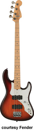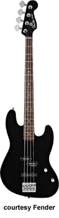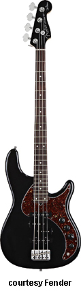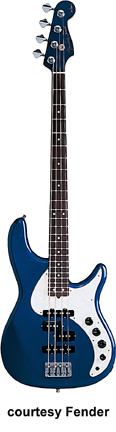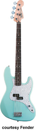 MARK HOPPUS SIGNATURE BASS (MEX. MFG. NO. 013-8300) | - alder Jazz-shaped body, maple Precision bass neck, 20-fret rosewood fingerboard with white dot inlays, four-ply White Pearloid pickguard, single Seymour Duncan Quarter Pound P Bass pickup, volume control, available in Black, Daphne Blue, Olympic White, Shell Pink (2002-03), or Surf Green finish 34 in.scale, mfg. 2002-present. |