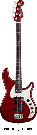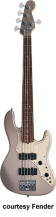 ROSCOE BECK V BASS FIVE-STRING (U.S. MFG. NO. 019-6500) | - offset double cutaway alder body, bolt-on maple neck with graphite reinforcement, 22-fret pau ferro fingerboard with pearl dot inlay, STB bridge, Roscoe Beck's signature on peghead, chrome hardware, mint white (or brown shell) pickguard, two Dual Jazz 5 pickups, two knobs (v, tone), three-way switch, two mini switches, available in 3-Tone Sunburst, Candy Apple Red, Shoreline Gold, or Teal Green Metallic finish, 35 in. scale, mfg. 1997-2006. |