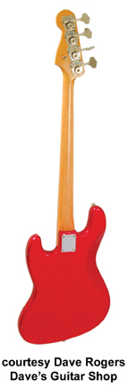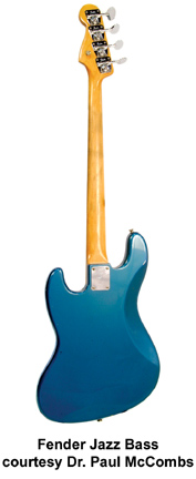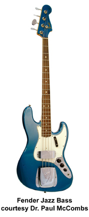 JAZZ BASS (CBS MFG. 1965-1981) | - offset double cutaway alder body, bolt-on maple neck, 20-fret rosewood fingerboard with pearl dot inlays, four-on-one-side tuners, fixed bridge with string mutes, F logo bridge cover, two J-style pickups, two concentric (v, tone) controls, tortoiseshell/metal pickguard with finger rest, chrome hardware, available in Blonde, Black, Custom Colors, or 3-Tone Sunburst finish, mfg. 1965-1981. |