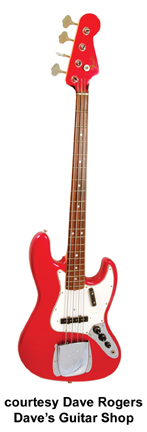 JAZZ BASS (FENDER MFG. 1960-64) | - offset double alder body, bolt-on maple neck, 20-fret rosewood fingerboard with pearl dot inlays, four-on-one-side tuners, fixed bridge with string mutes, F logo bridge cover, tortoiseshell/metal pickguard with finger rest, two J-style pickups, two concentric knobs (v, tone) controls, chrome hardware, available in 3-Tone Sunburst, Blonde, or Custom Colors finishes, mfg. 1960-64. |
