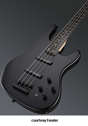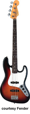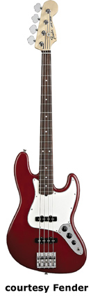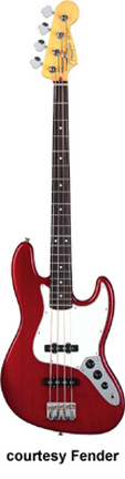HIGHWAY 1 JAZZ BASS (U.S. MFG. NO. 011-1400) | - offset double cutaway alder body, bolt-on modified C-shaped maple neck, 20-fret rosewood fingerboard with dot inlay, standard four-on-one-side tuners, standard vintage bridge, white pickguard, two Standard Vintage Single Coil pickups, three knobs (v, v, tone), available in 3-Color Sunburst, Daphne Blue Trans. (2003-06), Crimson Red Trans. (2003-06), Flat Black/Black (2006-present), Honey Blonde Trans., or Wine Red Trans./Midnight Wine (2006-present) finish, mfg. 2003-present. |