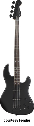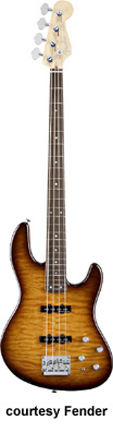 JAZZ BASS 24 (KOREA MFG. NO. 026-4500) | - offset double cutaway alder body, quilted maple top, contoured heel, bolt-on C-shaped maple neck, 24-fret rosewood fingerboard with dot inlays, four-on-one-side tuners, four-saddle standard bridge, no pickguard, two Seymour Duncan Bassline J-style pickups, four knobs (MV, blend, 3-band EQ), active electronics, jack on face, chrome (Cherry Sunburst or Tobacco Sunburst finish) or black (Flat Black finish) hardware, available in Cherry Sunburst (summer 2005-07), Flat Black (new 2009), or Tobacco Sunburst (summer 2005-08) finish, 34 in. scale, mfg. summer 2005-present. |