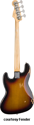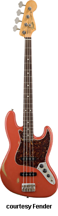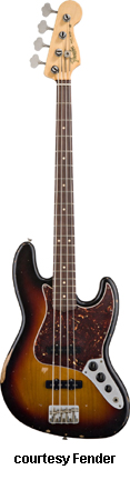 ROAD WORN '60s JAZZ BASS (MEX. MFG. NO. 013-1810) | - offset double cutaway Jazz-style distressed alder body designed to look "Road Worn," bolt-on C-shaped distressed maple neck, 20-fret rosewood fingerboard with pearl dot inlays, Jazz bass-style headstock, four-on-one-side vintage-style tuners, American vintage-style bridge with individual saddles, four-ply brown shell pickguard, two vintage Alnico Jazz Bass single coil pickups, three knobs (two v, tone) and output jack mounted on a chrome plate, distressed chrome hardware, available in 3-Color Sunburst or Fiesta Red finish, 34 in. scale, deluxe gig bag included, new 2009. |