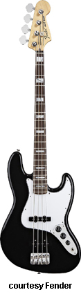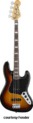 '70s JAZZ BASS (MEX. MFG. NO. 013-2000) | - offset double cutaway Jazz-style alder body based on a 1970s model, bolt-on '70s-style C-shaped maple neck, 20-fret bound rosewood fingerboard with pearloid block inlays, Jazz-style headstock with bullet truss rod adj. nut, four-on-one-side vintage 70s-style bridge with individual saddles, three-ply black (3-Color Sunburst) or three-ply white (Black finish) pickguard, two vintage-style Jazz Bass single coil pickups, three knobs (two v, tone) and output jack mounted on a chrome plate, chrome hardware, available in 3-Color Sunburst or Black finish, 34 in. scale, deluxe gig bag included, mfg. summer 2008-present. |