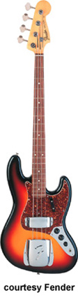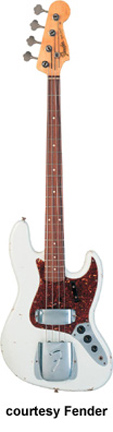 FENDER | Jazz Bass: Custom Shop Time Machine/Relic Series | For a full description of NOS, Closet Classic, and Relic finishes, please refer to the Stratocaster Custom Shop Time Machine Series category. | '60S RELIC JAZZ BASS (U.S. MFG. NO. 019-6300) | - offset double cutaway alder body, bolt-on maple neck, 20-fret rosewood fingerboard with dot inlays, four-on-on-side tuners, tortoiseshell pickguard, two Vintage Jazz single coil pickups, three knobs (two v, tone), aged nickel hardware, available in 3-Tone Sunburst or Olympic White finish, mfg. 1996-98. |