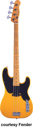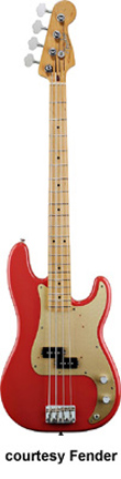 '50S PRECISION BASS (MEX. MFG. NO. 013-1702) | - offset double cutaway alder body, bolt-on one-piece maple C-Shaped neck, 20-fret maple fingerboard, gold anodized pickguard, single P-style pickup, two silver knobs (v, tone), chrome hardware, available in 2-Color Sunburst, Black, Fiesta Red, or Honey Blonde finish, mfg. summer 2005-present. |