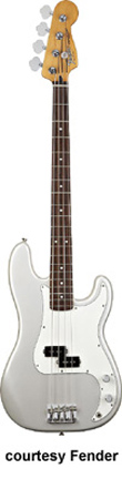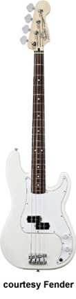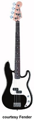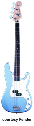 FENDER | Precision Bass: Standard Series | | STANDARD PRECISION BASS (MEX. MFG. NO. 013-6000/6100) | - offset double cutaway Precision Bass-style poplar body, bolt-on maple neck, 20-fret maple fingerboard with black dot inlays (6102, new 2009) or rosewood fingerboard with white dot inlays (6000/6100), Precision Bass-style headstock, four-on-one-side tuners, Precision bridge with individual saddles, three-ply white pickguard, single P-style pickup, two knobs (v, tone), chrome hardware, available in Arctic White, Black, Blue Agave (2002-05), Brown Sunburst (1994-present), Candy Apple Red (new 2009), Chrome Red (2006-08), Crimson Red Metallic (disc. 1998), Electron Blue (2006-08), Lake Placid Blue (disc. 1998, reintroduced 2009), Midnight Blue (1998-2001), Midnight Wine (1998-2008), or Sage Green Metallic (2002-05) finish, 34 in. scale, mfg. 1988-present. |