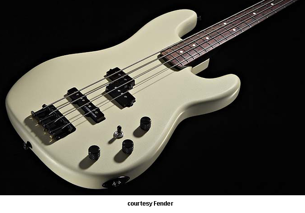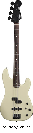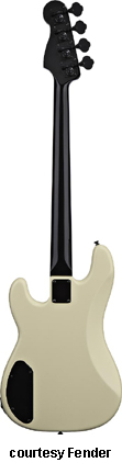 DUFF MCKAGAN PRECISION BASS (MEX. MFG. NO. 014-6500) | - offset double cutaway alder body, bolt-on maple modern C-shaped Jazz bass neck that is painted black on the back, 20-fret rosewood fingerboard with white dot inlays, skull and crossbones on the neckplate, black headstock overlay with a Jazz Bass special logo, four-on-one-side standard tuners, standard four saddle bridge, no pickguard, one P-style P bass pickup and one J-style Seymour Duncan pickup, three knobs (two v, Master TBX circuit), black hardware, available in Pearl White finish, 34 in. scale, deluxe gig bag included, mfg. late 2007-present. |