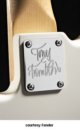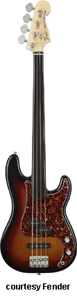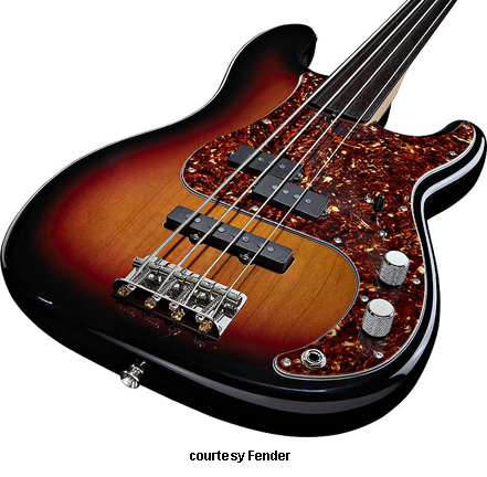 TONY FRANKLIN FRETLESS PRECISION BASS (U.S. MFG. NO. 019-0085) | - offset double cutaway alder body, bolt-on maple C-shaped neck, Tony Franklin engraved neck plate, fretless ebony fingerboard with no lines, four-on-one-side '70s style open-gear tuners with Hipshot Bass Xtender Drop-D tuning key on E string, American Vintage '70s bridge, four-ply brown or three-ply black pickguard, two Tony Franklin pickups (one J-style, one P-style), two knobs (v, tone), three-way switch, chrome hardware, deluxe black hardshell case included, available in 3-Color Sunburst or Black finish, mfg. 2006-present. |