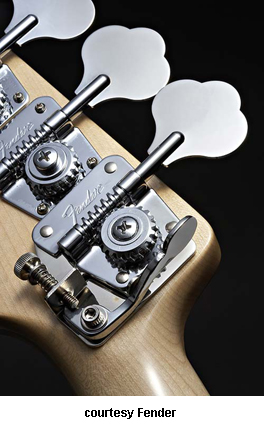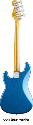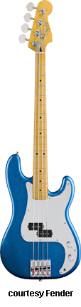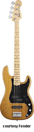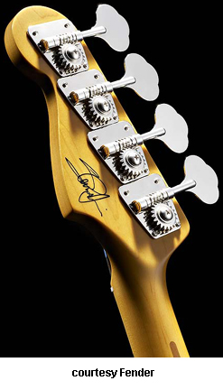 TONY FRANKLIN FRETTED PRECISION BASS (U.S. MFG. NO. 019-0086) | - offset double cutaway alder body, bolt-on maple C-shaped neck, Tony Franklin engraved neck plate, 20-fret maple fingerboard with black dot inlays, four-on-one-side '70s style open-gear tuners, American Vintage '70s bridge with single groove saddles, three-ply black pickguard, one Tony Franklin American P-Bass pickup and one Tony Franklin J-Bass pickup, two knobs (v, tone), three-way pickup switch, chrome hardware, deluxe black hardshell case included, available in Golden Amber or Olympic White finish, 34 in. scale, mfg. late 2007-present. |