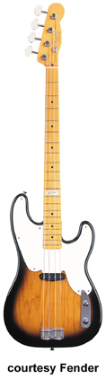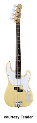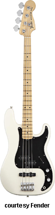 MIKE DIRNT SIGNATURE PRECISION BASS (MEX. MFG. NO. 013-4800) | - offset double cutaway ash body, bolt-on maple thick C-shaped neck, 20-fret rosewood fingerboard with dot inlays, four-on-one-side tuners, Bad Ass II bridge, white or Parchment pickguard style like the early 1950s P-Bass, one Custom Vintage '59 Split single coil P-bass pickup, two knobs mounted on metal plate, chrome hardware, available in 2-Color Sunburst, Black, or Vintage White finish, mfg. 2004-present. |
