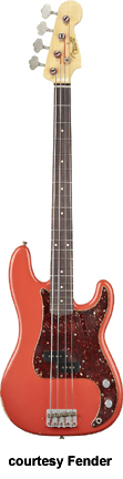 PINO PALADINO PRECISION BASS (CUSTOM SHOP NO. 015-8200) | - offset double cutaway select lightweight alder body, bolt-on maple C-shaped neck, 20-fret rosewood fingerboard with dot inlay, vintage style reverse tuners, American vintage style bridge, four-ply tortoise pickguard, one vintage Precision Bass single coil pickup, two knobs (v, tone), chrome hardware, vintage tweed hardshell case included, available in Fiesta Red over Desert Sand relic finish (shows natural wear, etc.), 34 in. scale, mfg. 2006-present. |