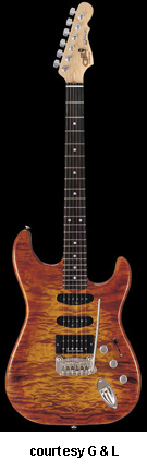 LEGACY DELUXE | - offset double cutaway Strat-style basswood body, figured maple top, bolt-on hard rock maple neck, 22-fret maple fingerboard with black dot inlays or rosewood fingerboard with pearl dot inlays, six-on-one-side Schaller tuners, G&L Dual Fulcrum vibrato, two vintage-style Alnico single coil and one Seymour Duncan humbucker pickups HSS, three knobs (v, two tone, coil splitter in knob), five-way pickup switch, chrome hardware, available in various finishes, mfg. 2001-present. |