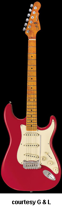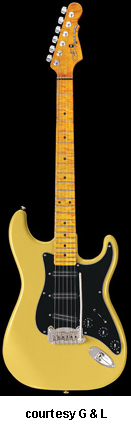 LEGACY | - offset double cutaway Strat-style alder (standard finish) or swamp ash (premium finish) body, bolt-on hard rock maple neck, 22-fret maple fingerboard with black dot inlays or rosewood fingerboard with pearl dot inlays, six-on-one-side Schaller tuners, G&L Dual Fulcrum vibrato, three-ply white pickguard, three vintage-style Alnico single coil pickups, three knobs (v, two tone), five-way pickup switch, chrome hardware, available in various finishes, mfg. 1992-present. |
