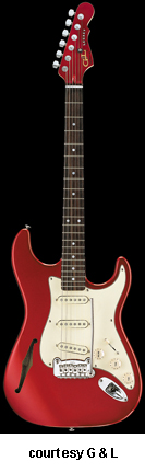 LEGACY SEMI-HOLLOW | - offset double cutaway Strat-style semi-hollow body, premium ash top and back, optional single f-hole on the bass bout, bolt-on hard-rock maple neck, 22-fret maple fingerboard with black dot inlays or rosewood fingerboard with pearl dot inlays, Strat-style headstock, six-on-one-side tuners, G&L Dual Fulcrum vibrato bridge, pearl, tortoise, shell, creme, mirrior, three-ply black or three-ply white pickguard, three Vintage V Alnico single coil pickups, PTB tone system, three knobs (v, t, b), five-way pickup switch, chrome hardware, available in standard and premier finishes, new 2008. |