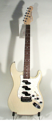 COMANCHE V | - offset double cutaway maple body, black pickguard, bolt-on maple neck, 22-fret maple fingerboard with black dot inlay, standard vibrato, six-on-one-side tuners, three Z-shaped single coil pickups, three knobs (v, two tone), five-way pickup switch switch, chrome hardware, available in Black, Blonde, Cherryburst, or Natural finish, mfg. 1990-91. |