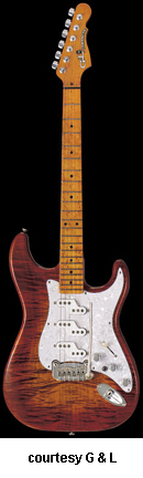 COMANCHE REISSUE | - offset double cutaway Strat-style alder (standard finish) or swamp ash (see-through finish) body, bolt-on hard rock maple neck, 22-fret maple with black dot inlays or rosewood fingerboard with pearl dot inlays, six-on-one-side locking tuners, G&L Dual Fulcrum vibrato, three-ply white pickguard, three G&L "Z-Coil" single coil pickups, three knobs (v, two tone), five-way pickup switch, mini-toggle switch, chrome hardware, available in various finishes, mfg. 1998-present. |