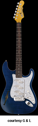 COMANCHE SEMI-HOLLOW | - offset double cutaway Strat-style semi-hollow body, premium ash top and back, optional single f-hole on the bass bout, bolt-on hard-rock maple neck, 22-fret maple fingerboard with black dot inlays or rosewood fingerboard with pearl dot inlays, Strat-style headstock, six-on-one-side tuners, G&L Dual Fulcrum vibrato bridge, pearl, tortoise, shell, creme, mirrior, three-ply black or three-ply white pickguard, three G&L MFD Z-coil humbucker pickups, PTB tone system, three knobs (v, t, b), five-way pickup switch, Expander switch, chrome hardware, available in standard and premier finishes, new 2008. |