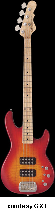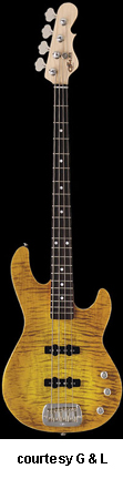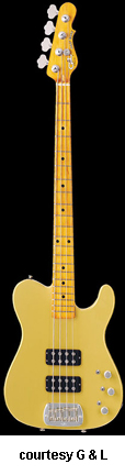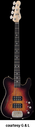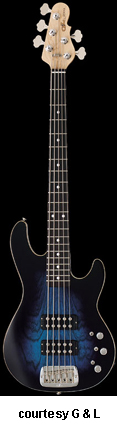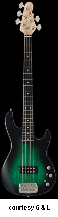 L-2500 FIVE-STRING | - five-string configuration, offset double cutaway basswood body, swamp ash top, bolt-on hard rock maple neck, 21-fret maple fingerboard with black dot inlays or rosewood fingerboard with pearl dot inlays, 3/2-per-side tuners, G&L Saddle Lock bridge, STB optional, no pickguard, two G&L Magnetic Field humbucker pickups, three knobs (v, t, b), three mini switches (pickup, series/parallel, preamp control), active/passive electronics, chrome hardware, available in various finishes, mfg. 1994-present. |