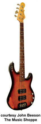 INTERCEPTOR BASS | - offset double cutaway ash, mahogany, or maple body, bolt-on maple neck, 21-fret maple fingerboard with black dot inlays or ebony or rosewood fingerboard with pearl dot inlays, four-on-one-side tuners, two bi-pole smaller humbucker pickups, volume/treble/bass controls, pickup selector switch, 34 in.scale, mfg. 1984-89. |