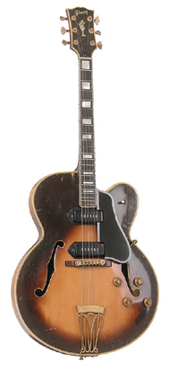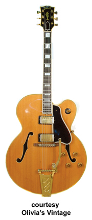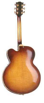 GIBSON | ELECTRIC: BYRDLAND SERIES | Please refer to the Custom Shop/Historic Collection section for current Byrdland production information. | BYRDLAND | - single round cutaway multi-bound hollow body, 17 in. wide by 21 in. long by 2.25 in. deep, 23.5 in. scale, solid spruce top, raised bound tortoiseshell pickguard, bound f-holes, maple back/sides/neck, 14/22-fret multi-bound ebony pointed fingerboard with pearl block inlay, tune-o-matic bridge/rosewood base, trapeze tailpiece, multi-bound blackface peghead with pearl flowerpot/logo inlay, 3-per-side tuners, gold hardware, 2 single coil Alnico (disc. late 1957) or humbucker (introduced 1958) pickups, 2 volume/2 tone controls, 3-position switch, available in Natural and Sunburst (most common) finishes, mfg. 1955-1985. |