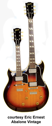 EDS 1275 (1963-68 MFG.) | - double cutaway solid SG style mahogany body, double neck configuration, 2 black 3-ply laminated pickguards, 3-position neck/pickup selector switches, 2 volume/2 tone controls, each mahogany neck has 20-fret bound rosewood fingerboard with pearl parallelogram inlay, tune-o-matic bridge/fixed tailpiece, 6-per-side/3-per-side tuners with pearl buttons, chrome hardware, 2 covered humbucker pickups, available in Jet Black, Cherry, Sunburst, or White finishes, mfg. 1963-1968. |